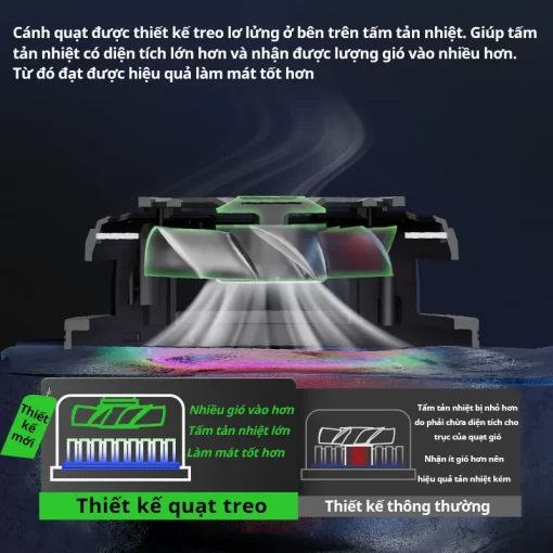 - Thiết kế cánh quạt: 7 cánh, gió 4 hướng, treo lơ lửng trên tấm tản nhiệt